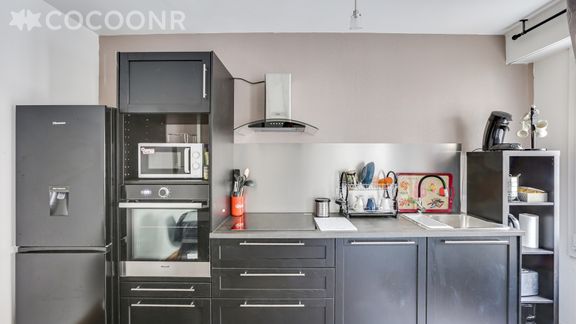 - Une cuisine ouverte sur le salon, entièrement équipée : réfrigérateur, lave-vaisselle, congélateur, four, plaques à induction, micro-ondes, grille-pain, bouilloire, cafetière à dosette Senseo..