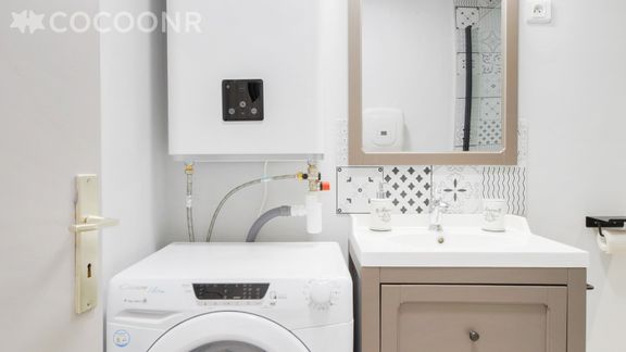 - Salle de bain avec douche spacieuse, lave-linge séchant et WC.