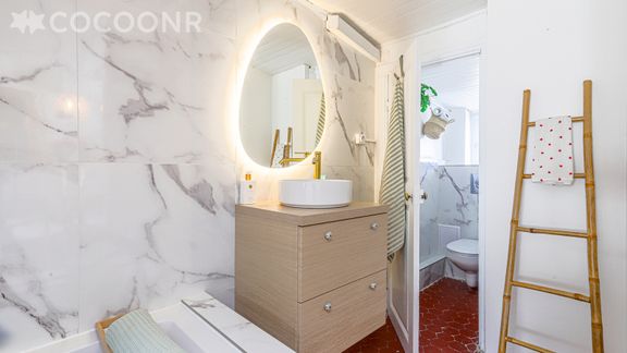 - Une salle de bain avec baignoire. La salle de bain est ouverte sur le séjour.