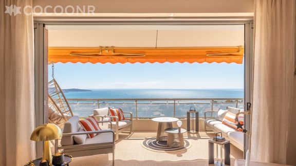 - Une première terrasse de 20 m² clôturée (orientée est), avec une superbe vue mer et vue montagne. Accessible depuis la pièce de vie et la chambre parentale, elle dispose de mobilier (salon de jardin et une balancelle) pour profiter des beaux jours.