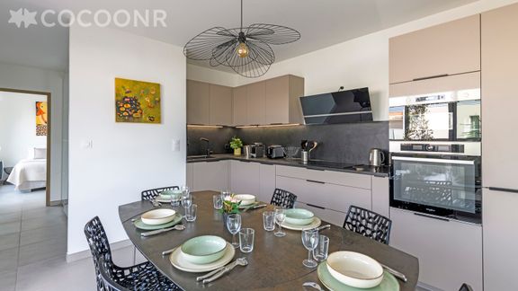 - Une cuisine équipée avec notamment : bouilloire électrique, four, four à micro-ondes, grille-pain, lave-vaisselle, plaques de cuisson et son espace repas