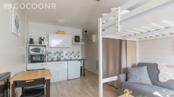 - Une pièce de vie de 17 m² avec TV, un canapé lit double (140×200), un lit double mezzanine (140×200) et un coin repas