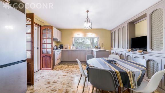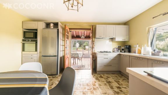 - Une cuisine équipée avec notamment : bouilloire électrique, four, four à micro-ondes, grille-pain, lave-vaisselle, plaques de cuisson, machine à bière... et espace repas.