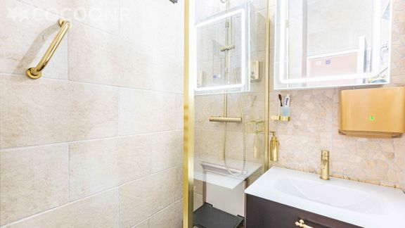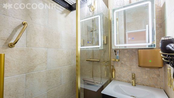 - Une salle d'eau avec douche, sèche-cheveux, sèche serviettes, siège de douche et étendoir
