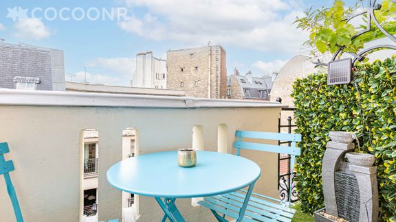 - Un balcon de 6 m² exposé sud/ouest, avec une table de jardin et deux chaises et une fontaine pour profiter des beaux jours