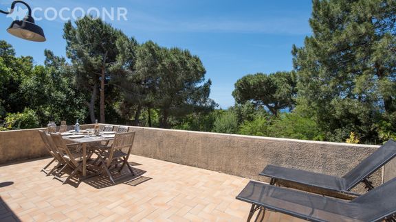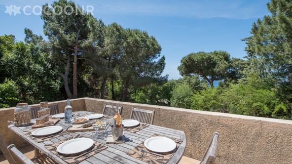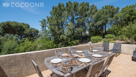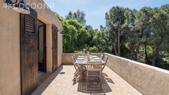 - Une grande terrasse exposée ouest avec vue splendide sur la pinède corse, ainsi qu'une table et des chaises d’extérieur pour profiter d'un repas au soleil !