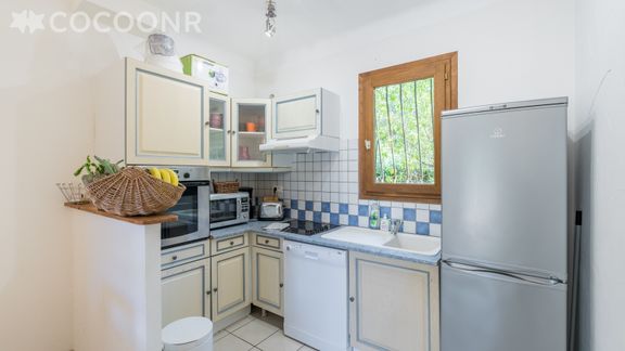 - Une cuisine ouverte, entièrement équipée : réfrigérateur, congélateur, lave-vaisselle, four, plaques à induction, batterie de cuisine, bouilloire, micro-ondes, grille-pain, cafetière Nespresso...