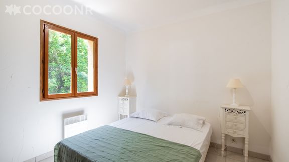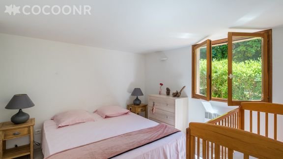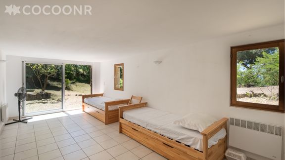 - Chambre 2 : 2 lits simples gigognes (4 couchages) avec un ventilateur portable, de grands placards, ainsi qu'un accès au jardin par une grande baie vitrée.