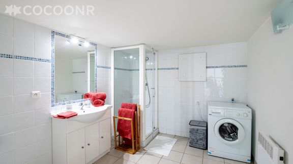 - Une grande salle d'eau avec une douche, un lavabo, un sèche-serviette et un lave-linge.