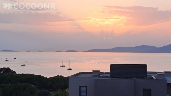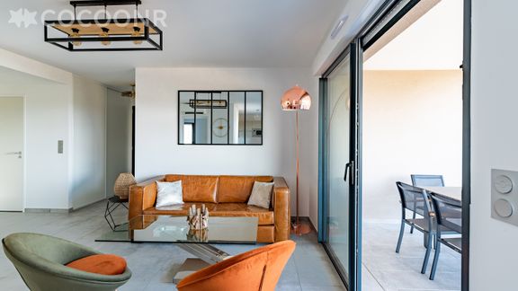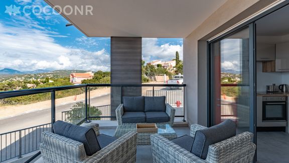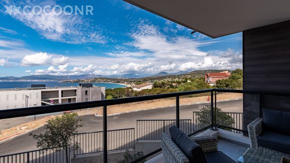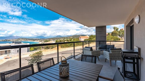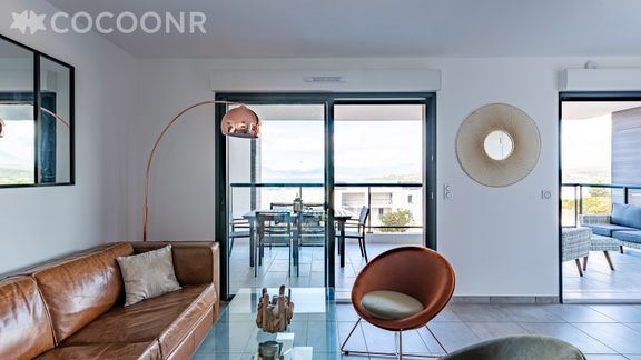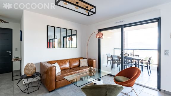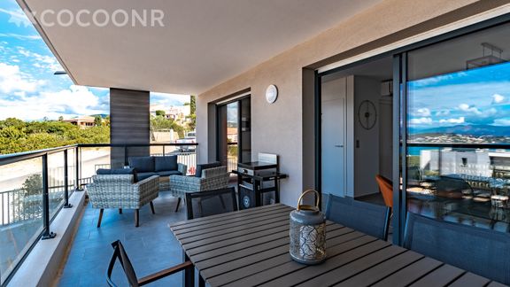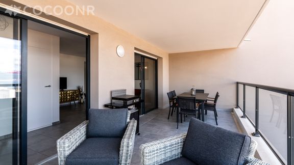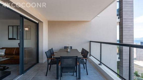 - Une belle terrasse de 19 m², orientée ouest avec une splendide vue mer. Elle est dotée d'un salon de jardin, une table haute et 6 assises ainsi qu'une plancha pour profiter d'un bon repas face au coucher de soleil !
