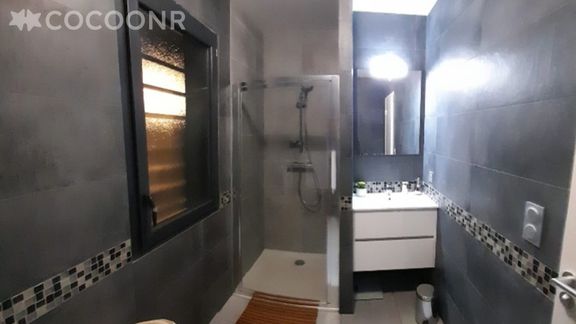 - Une salle d'eau avec une douche à l'Italienne, une vasque et un sèche-cheveux.