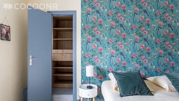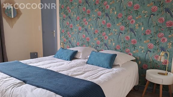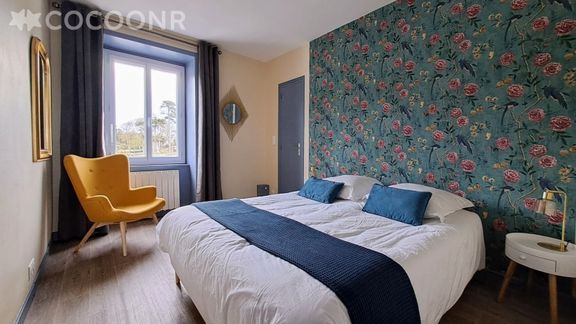 - Chambre 1 exposée Sud-Est avec vue sur le parc de l'amirauté : un lit queen-size (160×200), un fauteuil et un dressing.