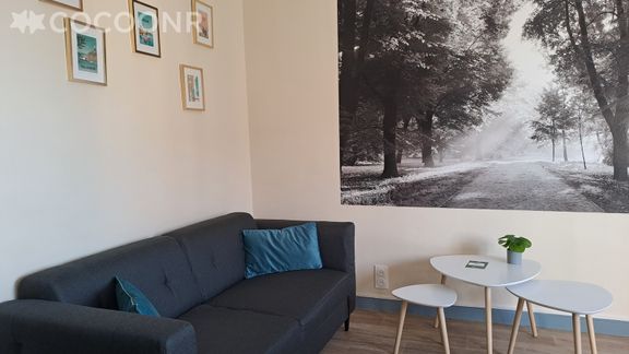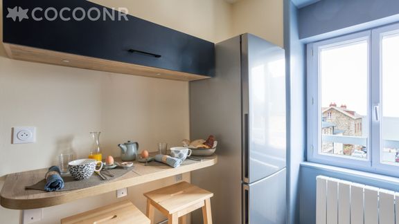 - Une pièce de vie de 13 m² exposée Nord-Ouest et vue mer, avec TV, Wifi, canapé, et un espace repas pouvant accueillir 4 convives.