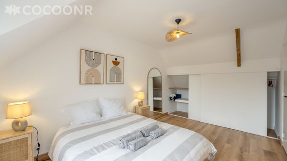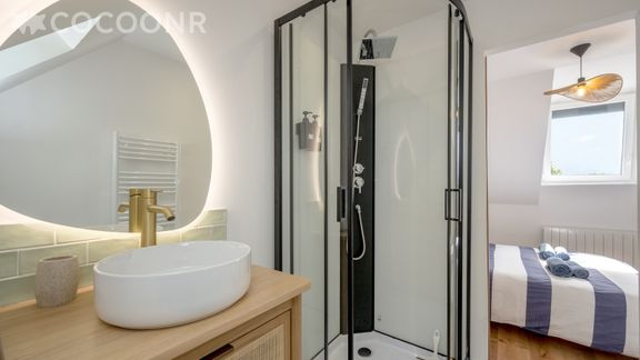 - Chambre 3 : un lit queen-size (160x200) avec rangements, salle d'eau attenante avec douche, meuble vasque