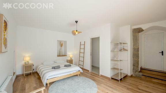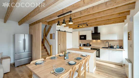 - Une pièce de vie de 30 m², équipée d'une télévision, d'un canapé-lit double et d'une cheminée (bois non fourni),