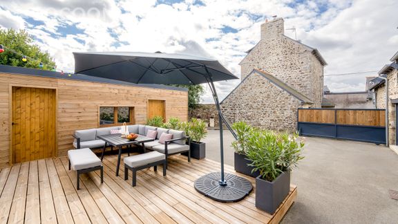 - La grande terrasse de 20 m² est entièrement aménagée pour les repas et apéritifs en plein air pour 10 personnes, avec parasol, coussins, lampes d'extérieur fixes et mobiles, et une guirlande solaire qui s’allume automatiquement.