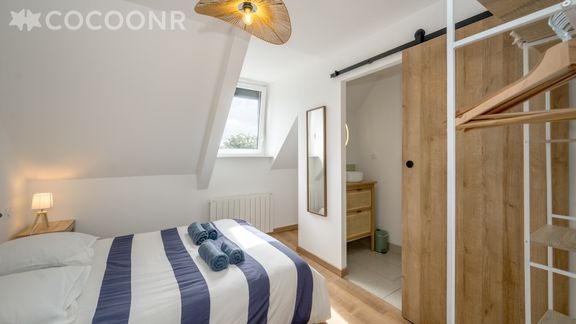 - Chambre 1 : un lit double (140x190) avec rangements, salle d'eau attenante avec douche, meuble vasque