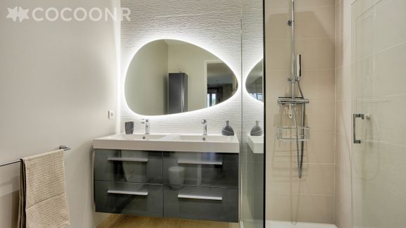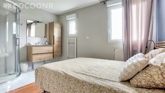 - Chambre 1 : un lit (140×200), salle d'eau attenante avec douche, meuble vasque, sèche-serviettes