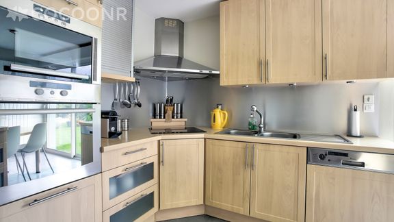 - Une cuisine ouverte équipée avec notamment : bouilloire électrique, four, four à micro-ondes, grille-pain, lave-vaisselle, plaques de cuisson...
