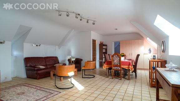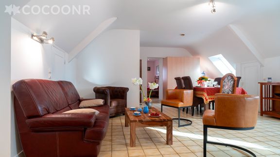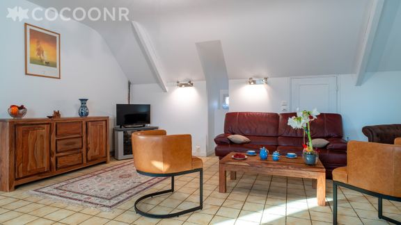 - Une pièce de vie de 45 m² avec canapé, fauteuils, TV
