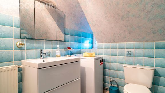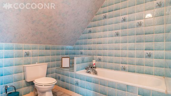 - Une salle de bain baignoire, WC, meuble vasque, lave-linge