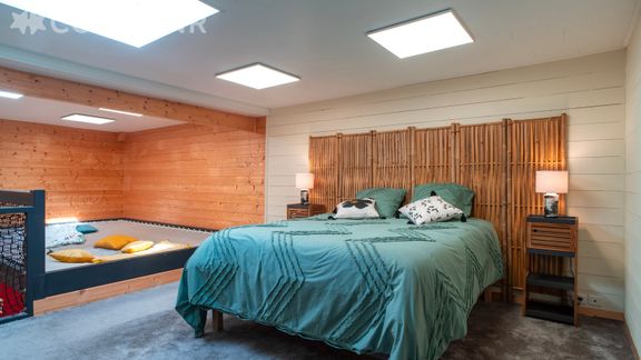 - Espace avec un lit queen-size (160×200), un lit simple et un filet suspendu