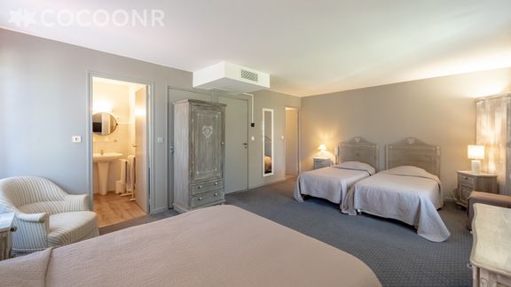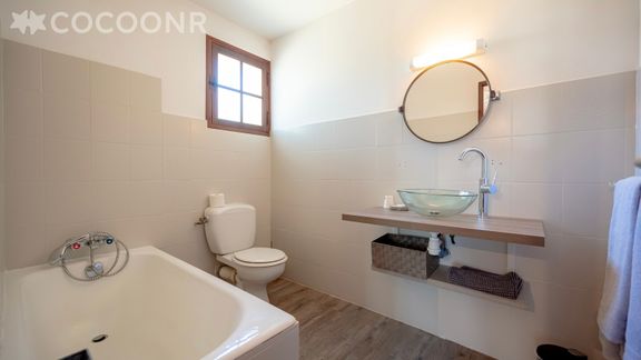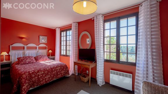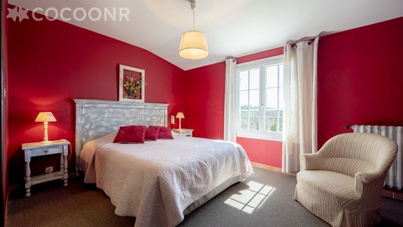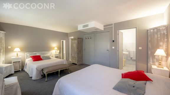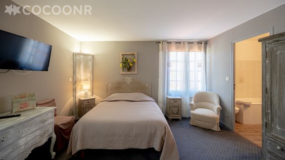 - Chambre 1 : un lit double (140×200), un lit queen-size (160x200) TV et deux salles de bain attenantes avec baignoire et WC