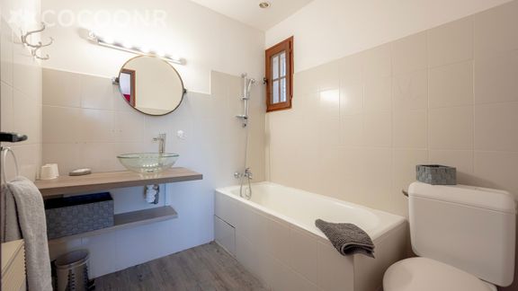 - Chambre 2 : un lit double (140×200), deux lits simples (90x200), TV, deux salles de bain attenantes avec baignoire et WC