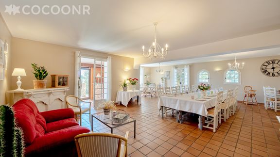 - Une pièce de vie de 85 m² avec canapés, fauteuils et cheminée (le bois sera en supplément les mois d'hiver) avec un coin salle à manger pour se réunir autour d'un bon repas, Wifi et TV
