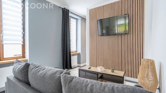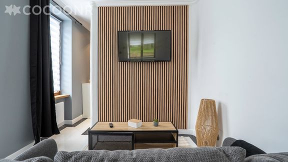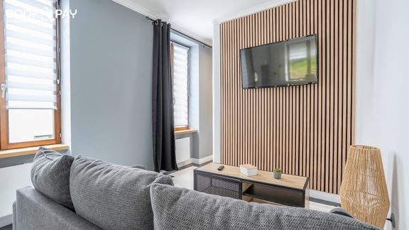 - Une pièce de vie de 20 m² avec TV, un canapé et un espace repas