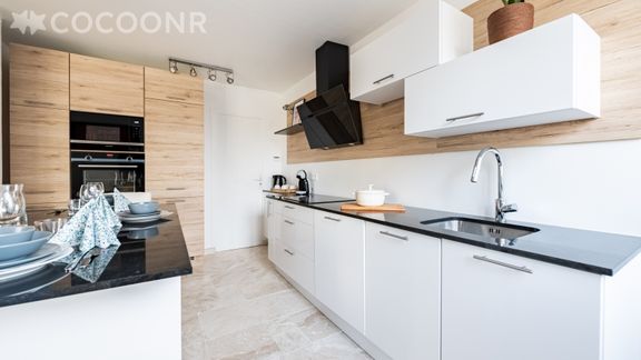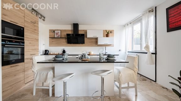 - Cuisine ouverte sur le séjour et intégralement équipée : lave-vaisselle, four, réfrigérateur, plaques de cuisson, micro-ondes, cafetière, bouilloire, grille-pain, vaisselle et couverts, espace repas autour de l’îlot central...