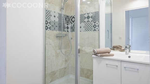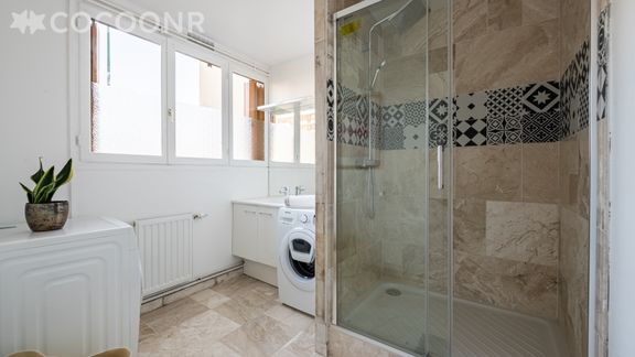 - Salle d'eau avec douche, machine à laver et sèche linge.