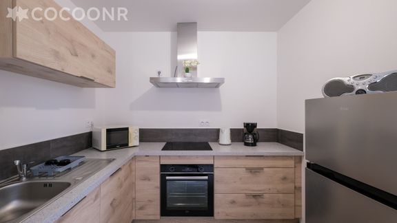 - Une cuisine équipée avec notamment : bouilloire électrique, four, four à micro-ondes, grille-pain, lave-vaisselle, plaques de cuisson...