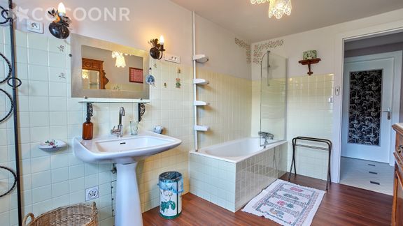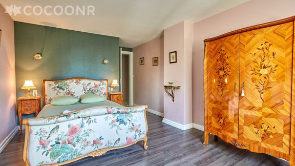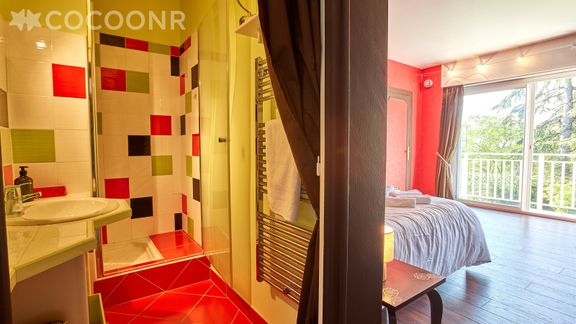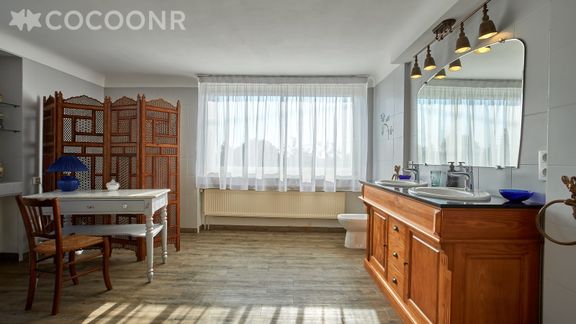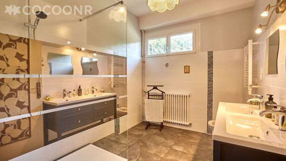 - Chambre 1 : un lit double (140×190), salle d'eau non attenante avec douche, meuble vasque,