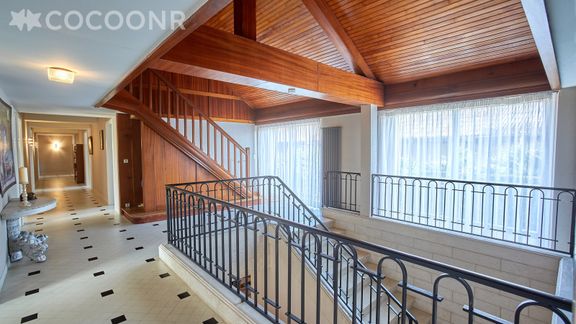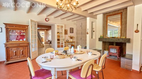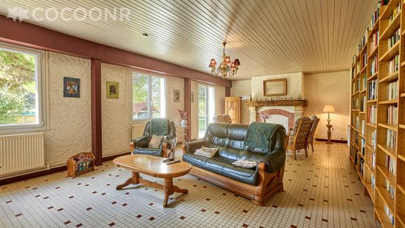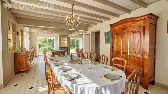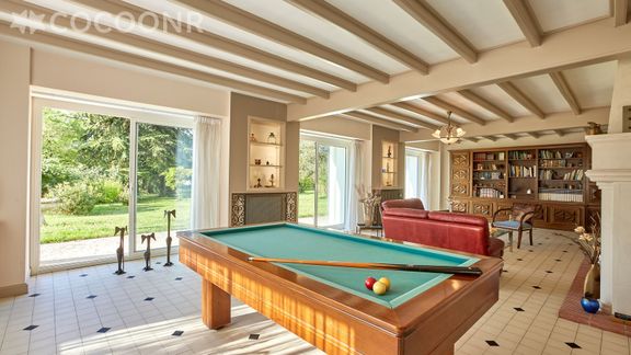 - Grand salon et salle à manger traversant avec fauteuils, table de billard, une bibliothèque, salle TV séparée de 35m², équipée de livres. Des volets roulants électriques sont installés