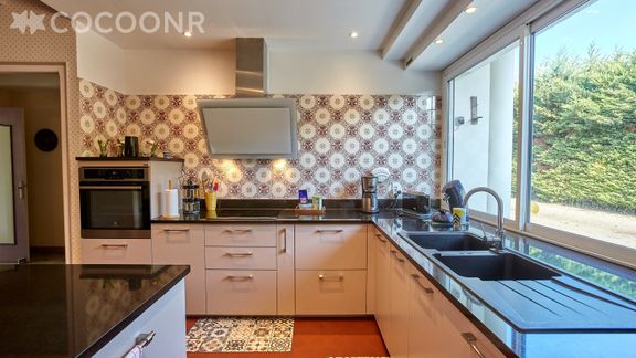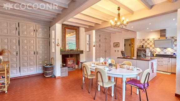 - Une cuisine de 40 m², avec poêle à bois, équipée avec notamment : bouilloire électrique, four, four à micro-ondes, grille-pain, lave-vaisselle, plaques de cuisson, machine à café...