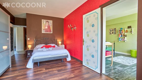 - Chambre 2 : suite parentale avec un lit double (140×190), petit sas, une salle d’eau avec douche, meuble double vasques et WC est attenante