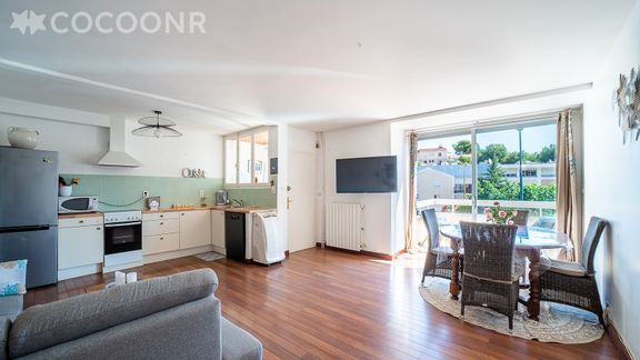 - Une pièce de vie de 30 m² avec canapé, TV et coin repas