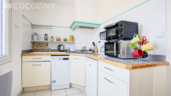 - Une cuisine équipée avec notamment : bouilloire électrique, four, four à micro-ondes, grille-pain, lave-vaisselle, plaques de cuisson...