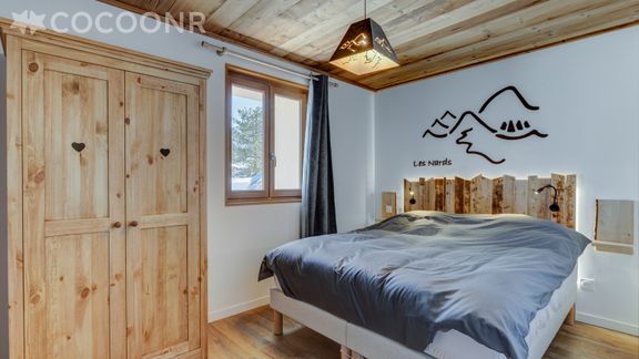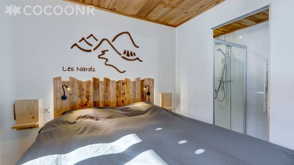 - Chambre parentale avec lit double 160 x 200 cm, rangements, TV et salle d'eau privative avec douche, serviette et vasque.