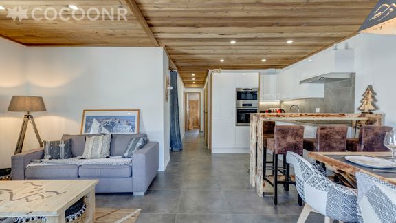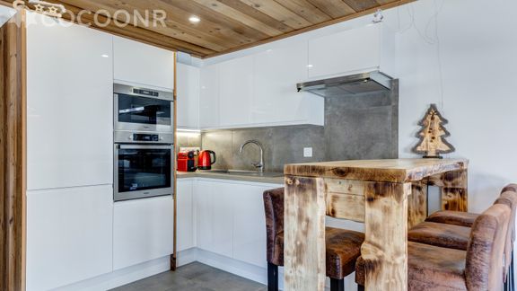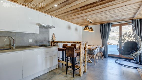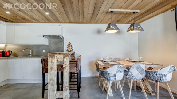 - Cuisine entièrement équipée avec table de bar pour 4 personnes : réfrigérateur, lave-vaisselle, plaque, bouilloire, micro-ondes, grille-pain, cafetière à dosettes Nespresso, appareil à raclette et fondue.