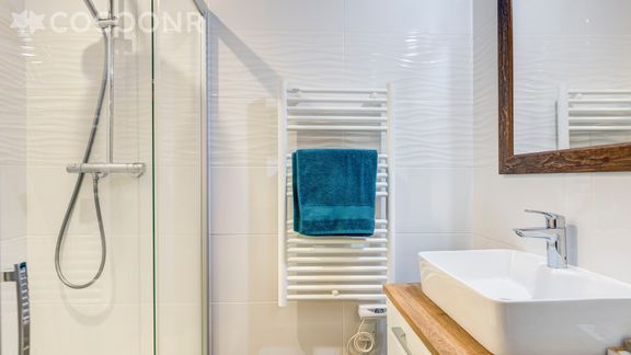 - Salle d'eau avec douche, vasque, sèche serviette et wc.