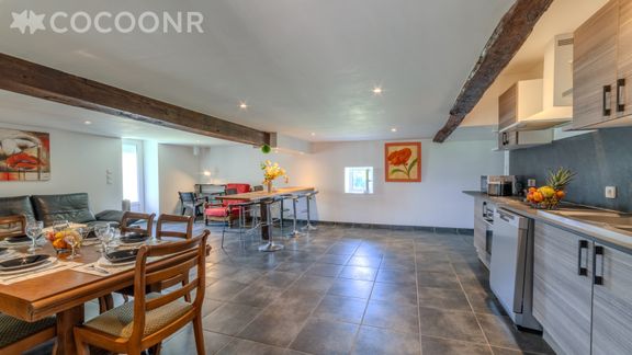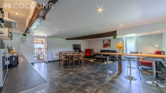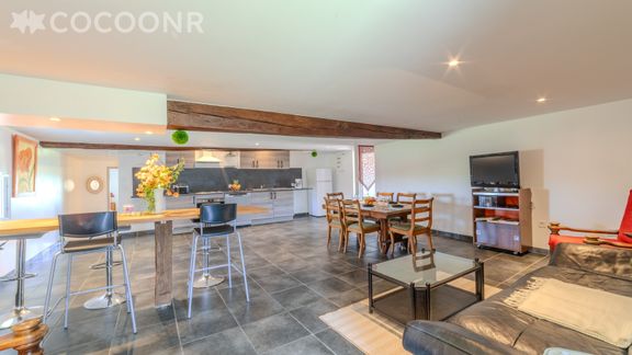 - Une pièce de vie de 45 m² avec TV, canapé, espace repas et cuisine ouverte équipée avec notamment : bouilloire électrique, four, four à micro-ondes, grille-pain, lave-vaisselle, plaques de cuisson...