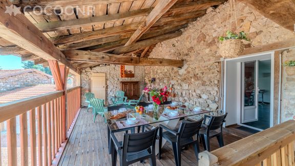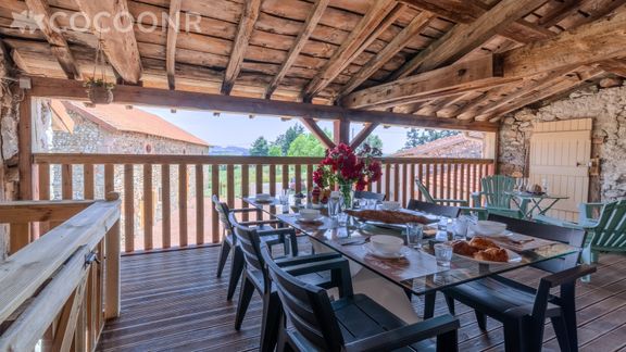 - Terrasse en bois de 25 m² avec table, fauteuils pour les repas, coin apéritif et plan de travail pour plancha ou barbecue.