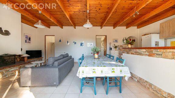 - Une pièce de vie de 35m² avec canapé, TV, coin repas, cheminée (bois non fourni)