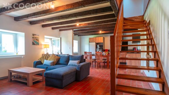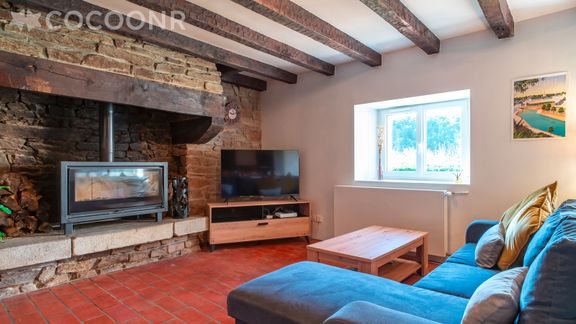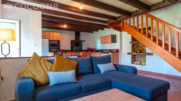 - Une pièce de vie de 20 m² avec TV, cheminée (bois fourni gratuitement), canapé et espace repas