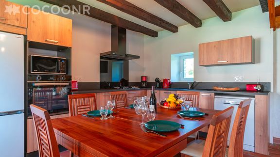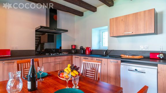 - Une cuisine ouverte équipée avec notamment : bouilloire électrique, four, four à micro-ondes, grille-pain, lave-vaisselle, plaques de cuisson...