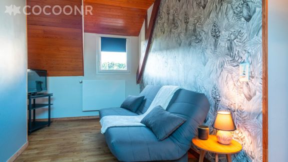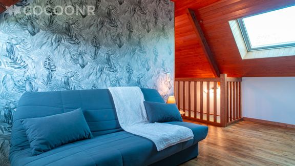 - Une mezzanine avec un canapé-lit double et une deuxième TV