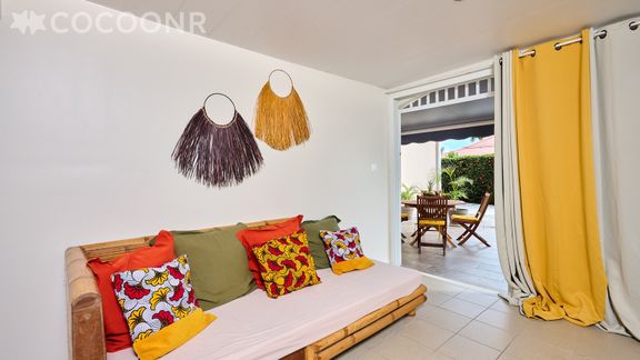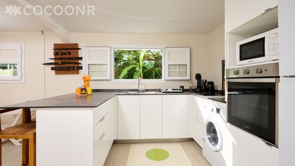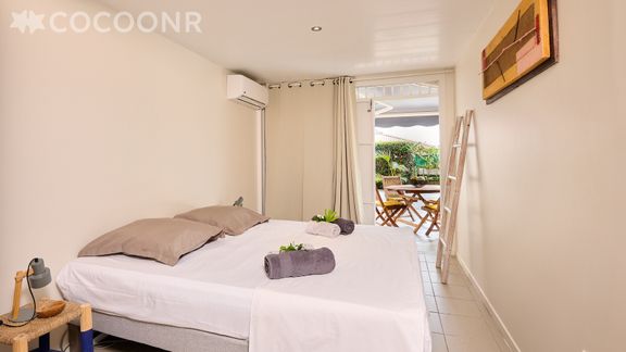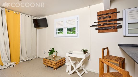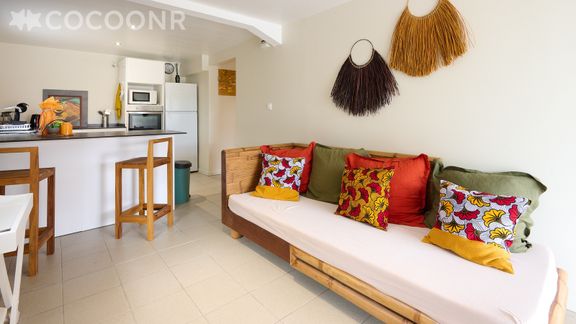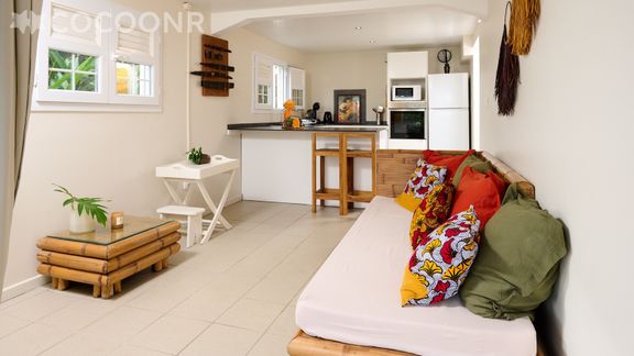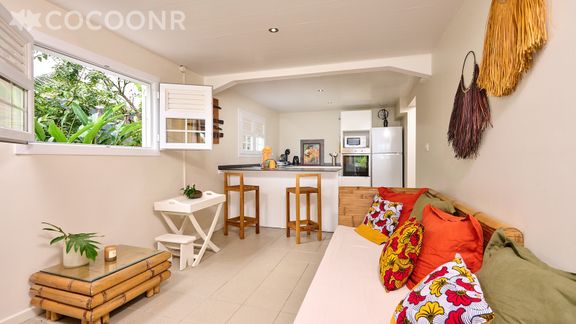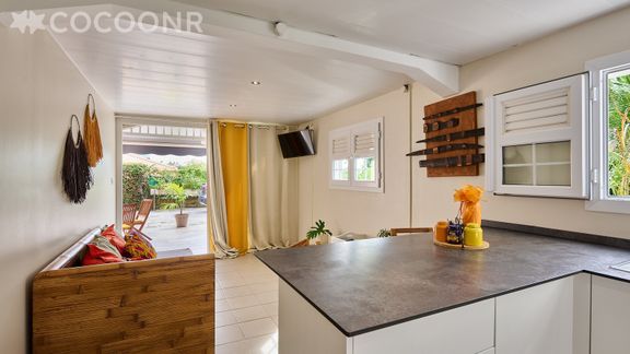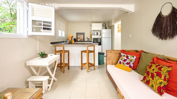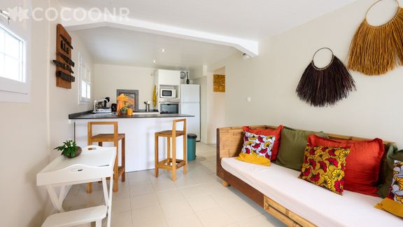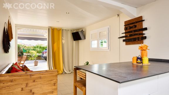 prêt à accueillir jusqu’à 3 voyageurs en quête de douceur. Nichée au rez-de-chaussée, il se compose d’une pièce à vivre lumineuse de 25 m², d’une cuisine ouverte équipée où les saveurs créoles se préparent en toute simplicité, d’une belle chambre où le repos se fait sur un lit queen-size, et d’une salle d’eau avec douche pour rincer le sel de vos aventures. Vous pourrez profiter du jardin privé de 150 m², écrin de verdure, pour vous détendre dans un transat et d'une terrasse de 24 m² pour vos petits-déjeuners en plein air. Wifi, draps et serviettes sont inclus, et un pot d’accueil vous sera offert à votre arrivée, parce qu’ici, vous êtes bienvenus, et nous n’attendons plus que vous!