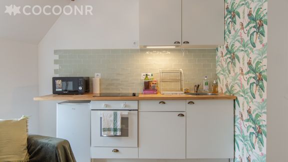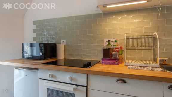 - Une cuisine équipée avec notamment : bouilloire électrique, four, four à micro-ondes, grille-pain, plaques de cuisson...